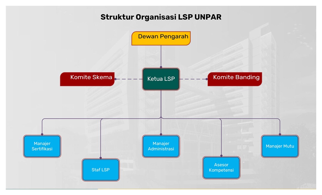 Struktur organisasi LSP UNPAR terdiri dari para profesional yang kompeten di bidangnya untuk memastikan bahwa setiap proses sertifikasi berjalan dengan transparan, objektif, dan sesuai standar nasional. Struktur ini dirancang untuk menjalankan tugas dan tanggung jawab secara efektif, sehingga setiap peserta sertifikasi mendapatkan layanan terbaik sesuai dengan standar kompetensi yang diakui oleh Badan Nasional Sertifikasi Profesi (BNSP).